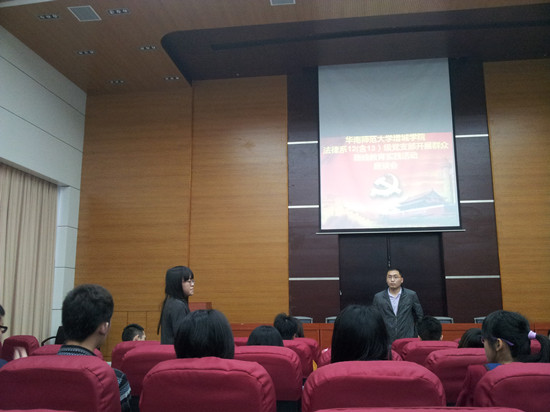为深入学习党中央十八大精神,扎实有效开展群众路线教育实践活动,法律系12(含13)级党支部结合学院党委和法律系党总支部的部署,于二十日下午四点三十分在图书馆学术报告厅开展了群众路线教育实践活动座谈会。此次座谈会由党支部书记祝建波主持,与会人员包括法律系党总支陈秀图书记、党支部副书记梁韵菁以及支部其他学生党员。