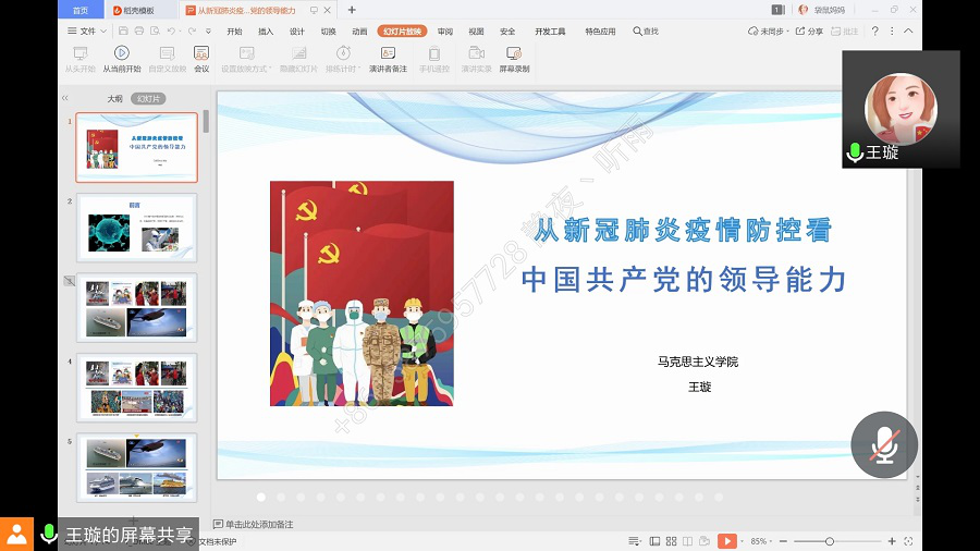 5月8日,王璇老师以《从新冠肺炎疫情看中国共产党的领导能力》为题,结合抗疫斗争的胜利从各方面详细讲述了自疫情发生以来,以习近平同志为核心的党中央高度关注疫情发展动态、部署疫情防控工作、明确强调“要把人民群众生命安全和身体健康放在第一位,坚决打赢疫情防控的人民战争、总体战、阻止战”。接着,王璇老师表示抗疫胜利离不开党的坚强有力的领导,作为一名入党积极分子在疫情面前,要把党的领导坚持到底,这是打赢“战疫”坚实的政治保证。