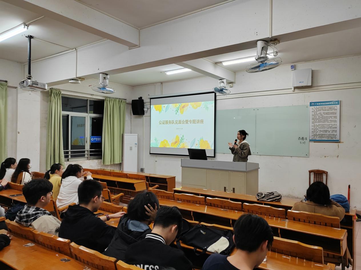 活动开始后,李慧和张昊琦简单的向同学们做了自我介绍,并简要说明服务队的后续活动安排。接着,李慧开展专题讲座,向队员们强调了关于值班的纪律以及各项工作的开展要求,并介绍了公证专题内容,包括公证书的形式、构成及签发、公证员的任职条件以及与日常相关的公证类型。