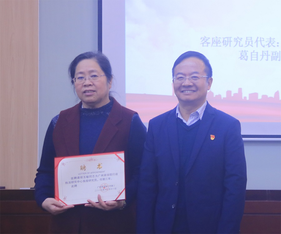 12月11日上午,广州商学院行政执法研究中心揭牌仪式暨学术沙龙在我校第二行政楼208会议室成功举办。本次活动由广州商学院122cc太阳集成游戏、中共广州市黄埔区依法治区办、黄埔区司法局共同承办。学校领导黄弢校长、欧洁梅副校长,黄埔区司法局领导欧阳注凡副局长,教学与科研工作部彭娟部长、黄炳超副部长,122cc太阳集成游戏领导赵家琪院长、陈秀图书记、唐犀副院长,中共广东省委巡视组、深圳市坪山区司法局、黄埔区公安局、区人社局、区生态环境局、区水务局、区卫生健康局、区知识产权局、区政务服务数据管理局、区水务局、区气象局、区规划和自然资源局、区教育局、新龙镇等相关部门负责人,广州大学、东莞理工学院等高校专家学者,北京易和律师事务所负责人,122cc太阳集成游戏师生代表共40余人参加了本次活动。揭牌仪式由122cc太阳集成游戏副院长唐犀主持,教学与科研工作部副部长黄炳超宣读了行政执法研究中心成立文件。黄弢校长和行政执法研究中心主任崔卓兰教授共同为行政执法研究中心揭牌,颁发客座研究员聘书。