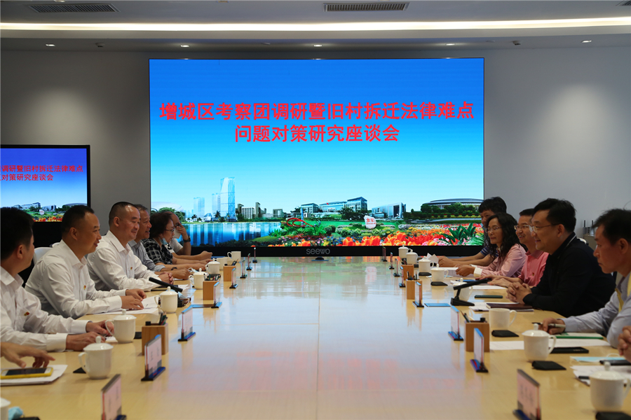 10月21日,中共广州市黄埔区委政法委员会召开旧村拆迁法律难点问题对策研究座谈会,并迎接增城区委常委、政法委书记李永盛一行调研。122cc太阳集成游戏院长赵家琪作为法学专家代表讲授旧村改造相关法律知识,副院长唐犀、教师代表崔卓兰教授、饶艾教授、吴海岸老师应邀参会。