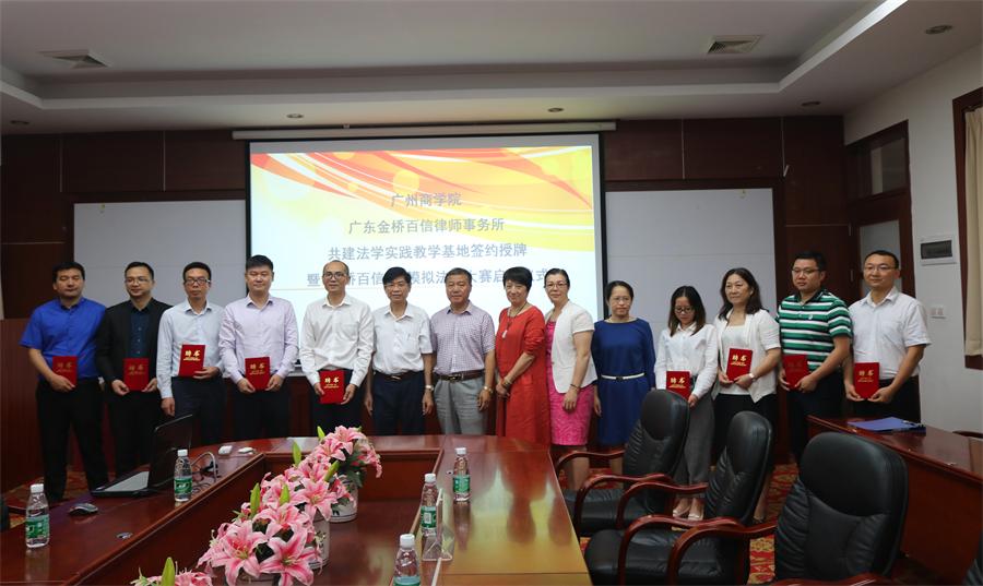 冼德庆代表广州商学院与金桥百姓律所正式签订合作协议,并与赵家琪一起为金桥百信律师事务所授牌,还为担任“金桥百信杯”模拟法庭大赛指导老师的10多名律师颁发聘书,聘请他们为122cc太阳集成游戏实践教学指导老师,任期两年。
