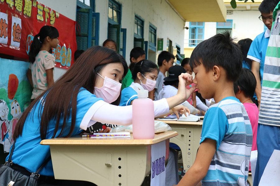 早上8:30,“阳光小体检”活动正式开始。本次体检设置的项目有视力测试、色觉测试、身高体重测试、血压测试和沙眼龋齿检查 五个方面。小学生们在小老师带领下准时到达体检现场,并在不同的项目摊位上有序排队进行检查。虽然活动现场天气炎热,但丝毫不减队员们为小学生提供身体检查服务的热情,队员们对每个学生都进行了认真细致地体检,对体检的结果作了详细记录,同时还向一些学生提出了有针对性的合理保健意见,引导学生养成良好的卫生习惯,这对常见疾病的预防和控制起到了积极的促进作用。在体检结束后,医疗卫生组的队员们对于体检出的异常情况及时反馈给学校,并及时告知学生家长,建议到医院做进一步的复查,让身体可能出现状况的学生得到及时的救助和治疗。