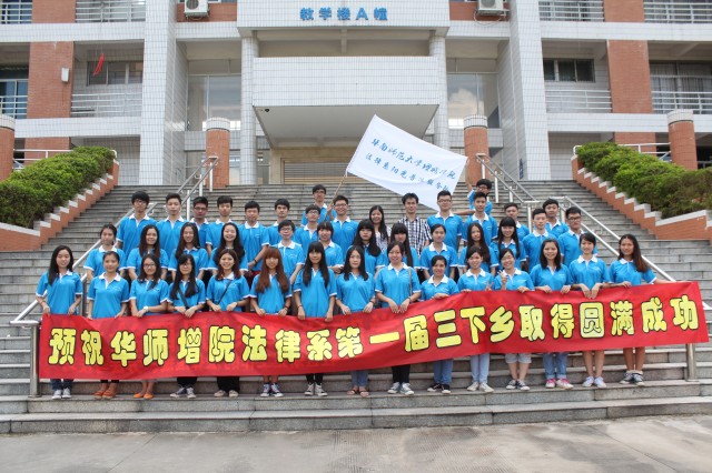 华南师范大学增城学院法律系首届暑期“三下乡”社会实践活动于2013年7月7日正式启程,法律系阳光普法服务队前往汕头市潮南区两英镇陈库学校开展以“传承五四精神,共筑青春梦想”为主题的大学生暑期“三下乡”社会实践活动。参加本次社会实践活动共有队员44名,由法律系辅导员张仁瀞、叶小办担任指导老师。