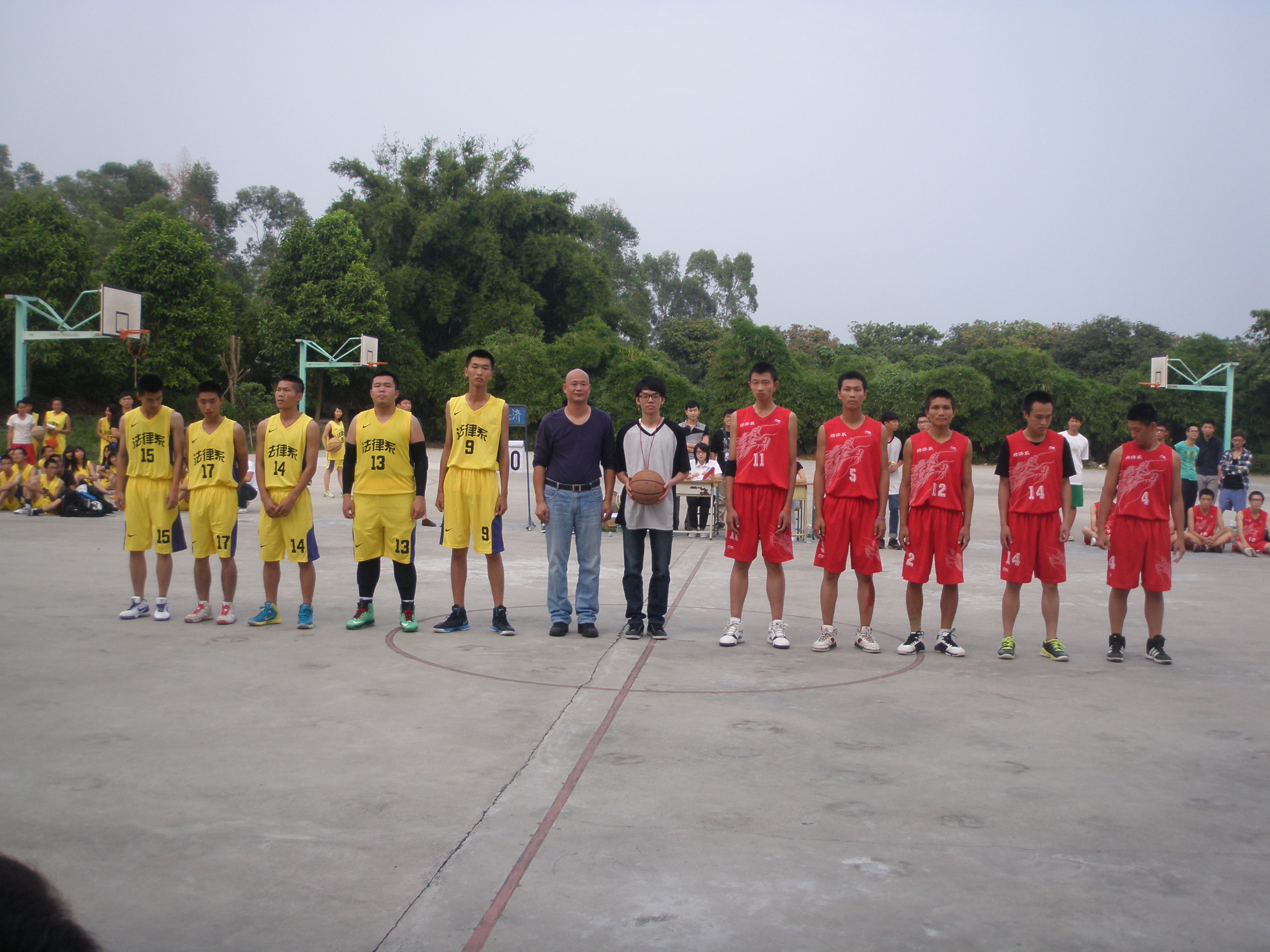 本次新生杯篮球赛的开幕仪式简短而又附有激情:主持人开场白后,学生处处长张秋艳老师发表讲话,之后由雷翔主任进行递球仪式,为第七届13级新生杯拉开序幕,同时新生杯篮球赛第一场比赛——法律系男篮对战经济学男篮的比赛也正式打响。主裁判抛球后,法律系17号球衣黄浩林奋勇抢到第一球,但法律系的第一次进攻却迎来了经济系11号的本场赛事的第一个盖帽,法律系迎来的第一个挫折,但接下来在第一节比赛中法律系更迎来了0比15的低谷期,直到法律系14号徐神杰队长带领着球队得到了本赛的第一个进球,法律系的真正比赛状态才出来。而到了第二、三节法律系的球员奋勇拼搏逐渐缩小双方比分差距。到了第四节,比赛到了一个白热化阶段。虽然法律系奋勇抗争,但还是以42比45不敌经济系输掉了比赛。