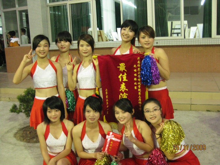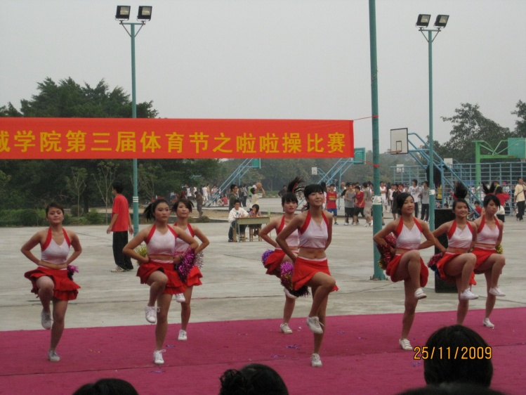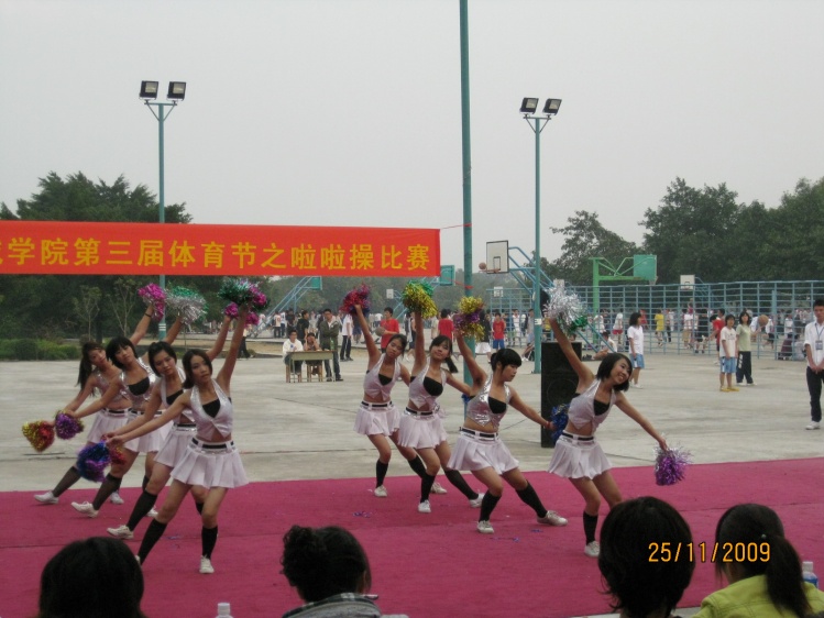2009年11月26日下午5点,由学院公关部主办、各系公关部协作承办的第三届啦啦操大赛在灯光篮球场隆重举行。莅临的评委有李运生院长、学院党委谭马利副书记、学院团委王龙华书记、陈抗老师、赵金珠老师等。
