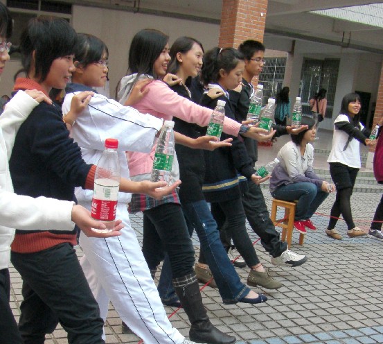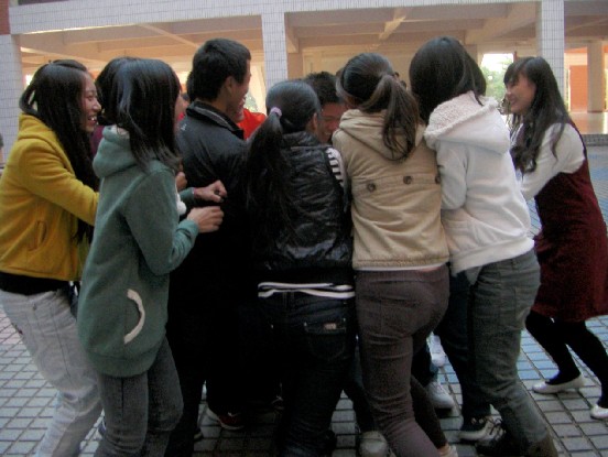 “数字游戏”结束后.接着进行了室外活动.分别有“摩肩接踵”“人墙游戏”在这两个游戏中, 让大家感受到压力的力量,从而摆脱压力。活动的目的在于在愉悦的气氛中学习到心理知识,潜移默化一些心里精神理念,加强干部干事之间的默契,增进互相的了解和认识,最终在活动后提高学生干部的抗压能力。