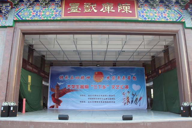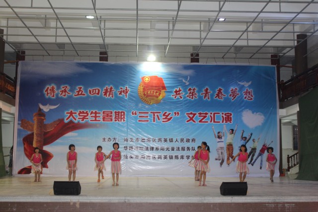 2013年7月12日下午五点,经过法律系阳光普法服务队队员们的精心筹备,一场队员们与小朋友们同台演出,以“弘扬五四精神,共筑青春梦想”为主题的文艺汇演在潮南区两英镇陈库戏台正式上演。出席本次文艺汇演的嘉宾有潮南区两英镇党委委员陈立华、张毅岚、黄汉彬,司法所所长洪耀鹏、团委书记郭奕妹、党政办林微同志、陈库社区支部书记吕徐洲,陈库学校校长廖映珊、副校长连淑贤以及华南师范大学增城学院法律系暑期“三下乡”社会实践活动指导老师张仁瀞、叶小办。