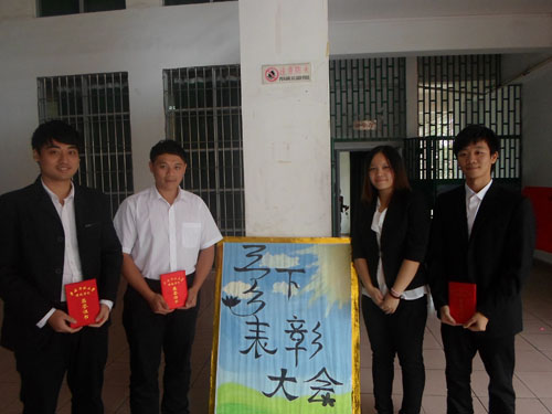 活动开始之际,主持人以精彩的开场白拉开了序幕,紧接着进入视频回顾和代表发言环节,向同学们展示三下乡活动的点滴记录,体现了新一代大学生朝气蓬勃和积极向上的热血青春。接下来,活动进入高潮环节——宣读表彰决定,在本次活动中,法律系光荣地获得了“展青春风采,建幸福新村”先进服务团称号,其中,黄沁师姐、陈冬旭师兄、陈嘉祥师兄以及陈沈斌师兄四人获得暑期“三下乡”社会实践先进个人称号。汪书记分别为他们颁布了荣誉证书。