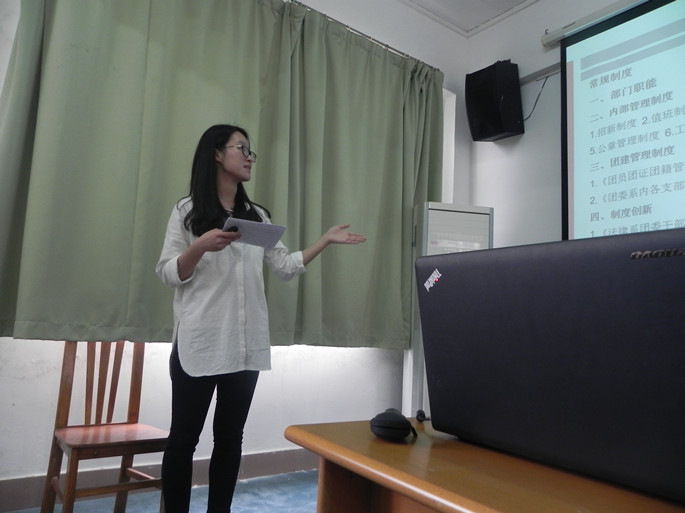法律系团委副书记张婷和法律系学生会主席何其琛分别对系团委和学生会工作情况进行了汇报。主要内容包括团委的干部干事的录用、培养和考核制度以及组织制度建设,组织所举办的活动等情况汇报。通过简要介绍,让各位领导老师对我系团委、学生会的工作有了基本的了解。