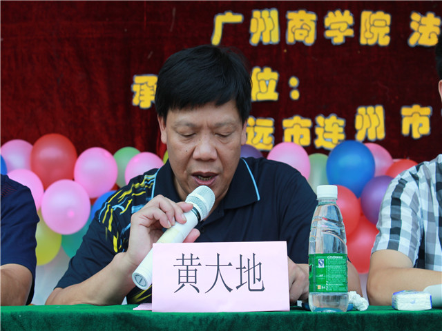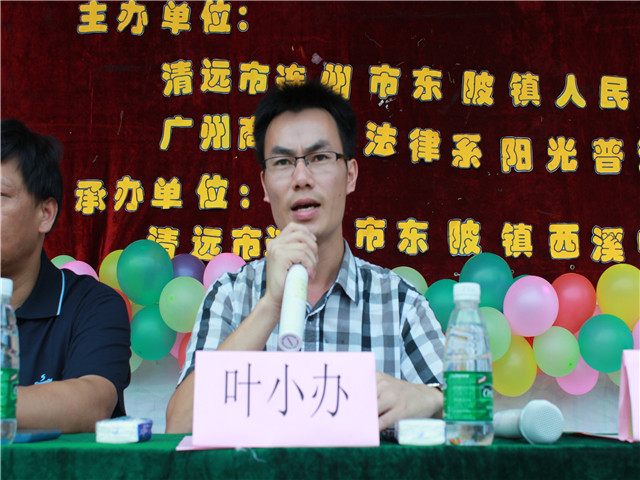 启动仪式上,首先由东陂村村委书记张诚发表重要讲话,他指出“三下乡”实践活动的开展不但开拓了学生们的知识面,而且丰富了校园文化生活,能够促进服务队的大学生和西溪中心学校的同学们共同成长,一起在实践中圆梦,达到双赢,于此同时,他表示将积极配合服务队开展普法调研活动,让村民们了解更多的法律知识,提高村民的法律意识,加强保护自身的能力;随后,西溪中心学校副校长黄大地以西溪中心学校学生的全面发展为基点,提出本次与阳光普法服务队合作开展的社会实践活动是为了拓宽当地学生的视野,鼓励接受不同形式的教学方式,激发创造力,也希望能借此机会丰富学生们的暑假生活,让学生们过上一个有意义的暑假。最后,阳光普法服务队的指导老师叶小办从服务队的队员自身发展出发,要求队员们做好吃苦的准备,积极投身到实践活动当中去,在提高自己能力的同时为社会、为国家做贡献。另外,服务队指导老师叶小办承诺将以高度的责任感和顽强的毅力完成本次社会实践活动,向当地和学校交出一份满意的答卷。在仪式上,广州商学院法律系阳光普法服务队还向当地的贫困村民捐赠了一批物资。