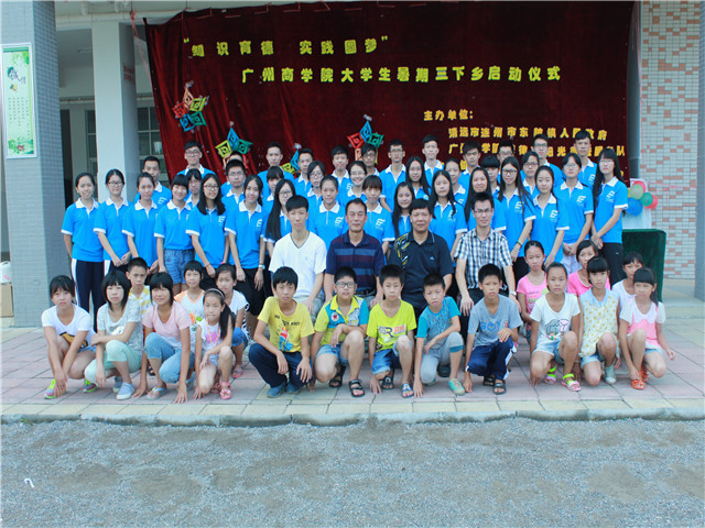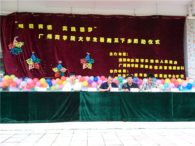 2014年7月15日上午9点,广州商学院法律系第二届“三下乡”社会实践活动启动仪式在广东省清远市连州市东陂镇西溪学校隆重举行。莅临本次启动仪式的领导和嘉宾主要有:东陂村村委书记张诚、东陂镇团委委员黄炜炜、西溪中心学校副校长黄大地以及服务队指导老师叶小办。