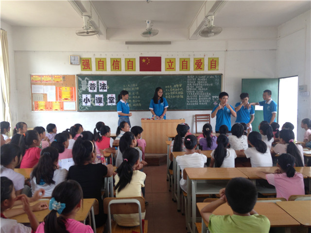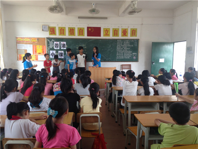 2014年7月17日,是广州商学院法律系阳光普法服务队开展支教活动的第六天,同学们迎来了普法调研组的“普法小课堂”。为增强同学们的法律意识和安全文明意识,普法调研组开设了以“关爱明天,普法先行”为主题的普法知识课堂。