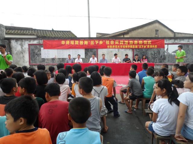 2012年7月5日,华南师范大学增城学院暑期“三下乡”服务队在潭西中心小学举办了隆重的暑期“三下乡”社会实践活动启动仪式。莅临此次仪式的嘉宾分别是:潭西镇中心小学林火金副校长、潭西村林俊拔村民委员会主任、服务队指导老师冯勤辉老师、张仁瀞老师、叶小办老师,以及潭西镇中心小学庄坤亮主任、团委陈永銮书记。