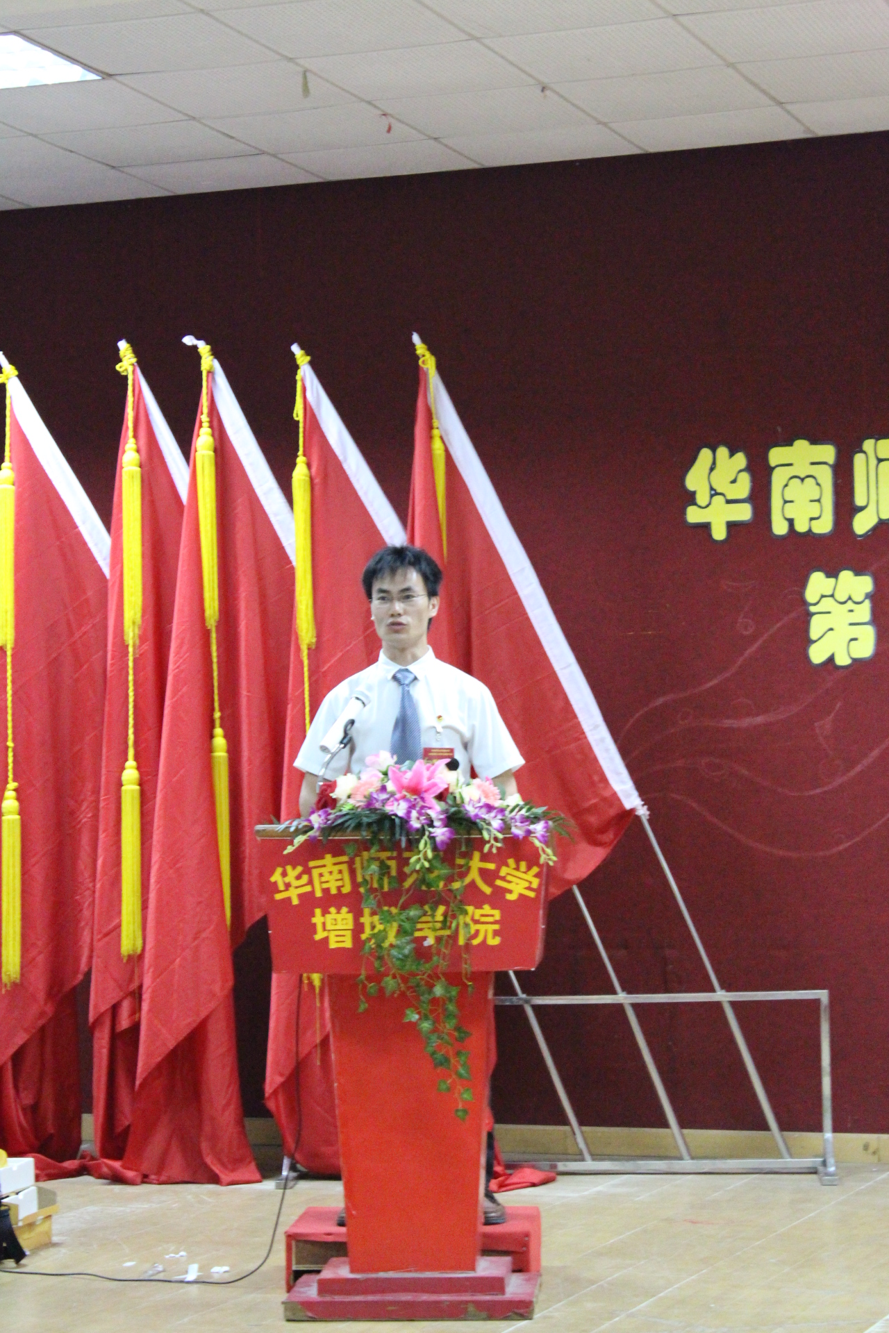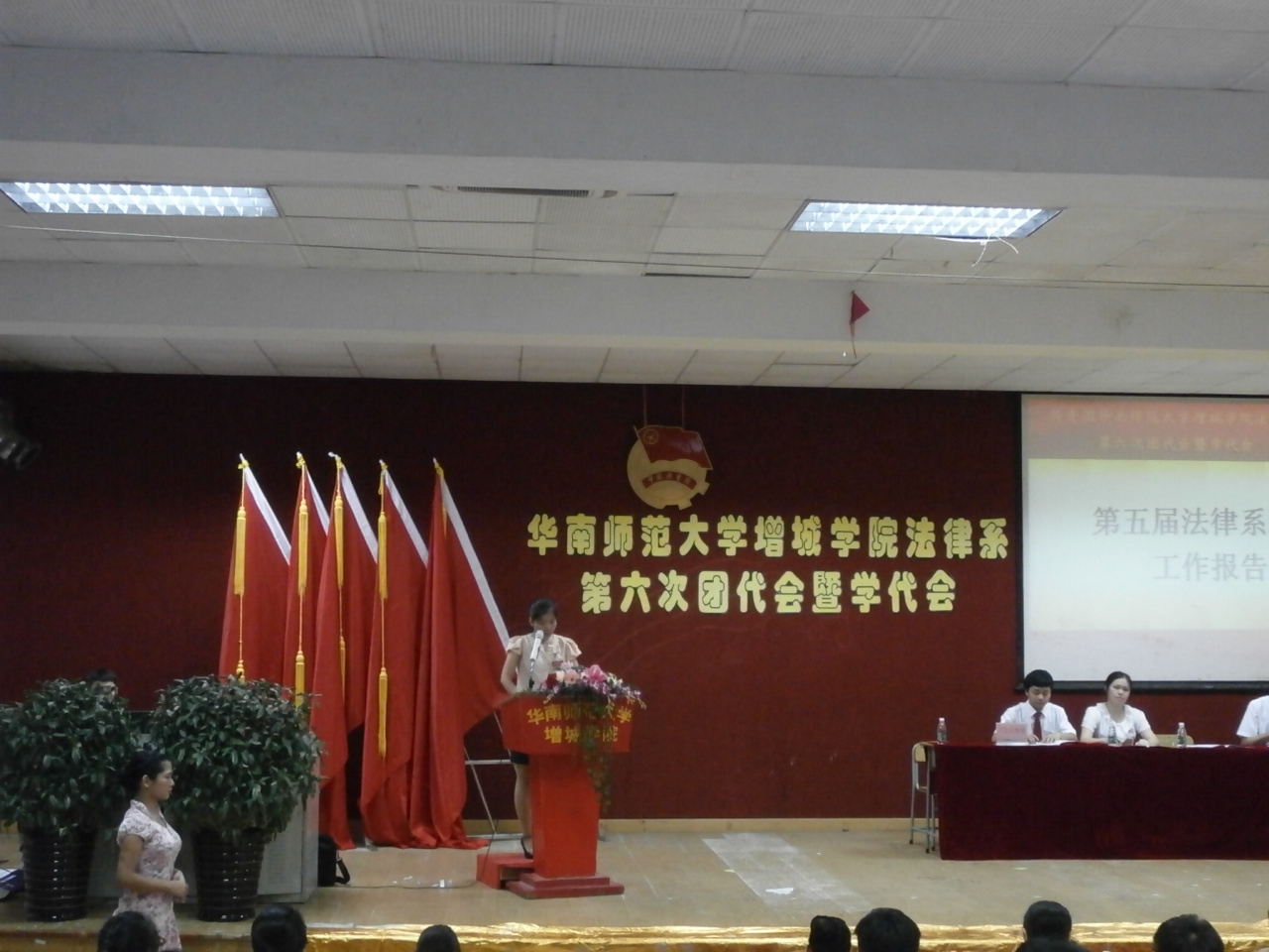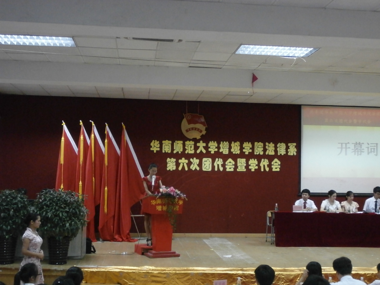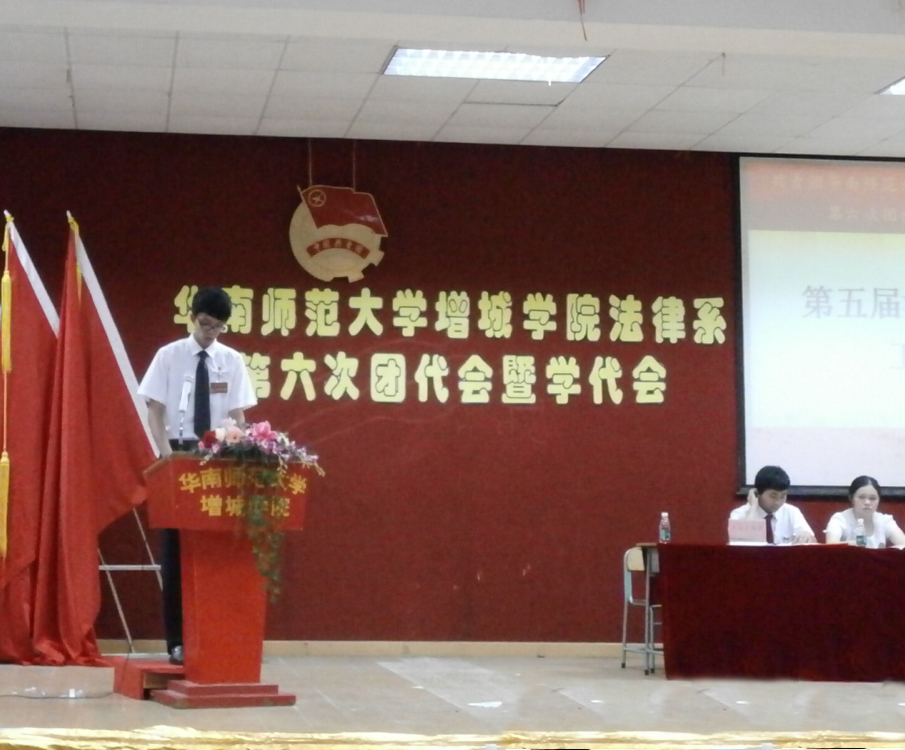 2013年6月2日晚上7点在华南师范大学增城学院A206,我们迎来了两年一度的团代会暨学代会举行仪式。18:30举行了预备会议表决通过的代表资格、选举办法、监票人名单与会议流程后,由主持人陈东旭同志宣布大会开幕,并奏中华人民共和国国歌。