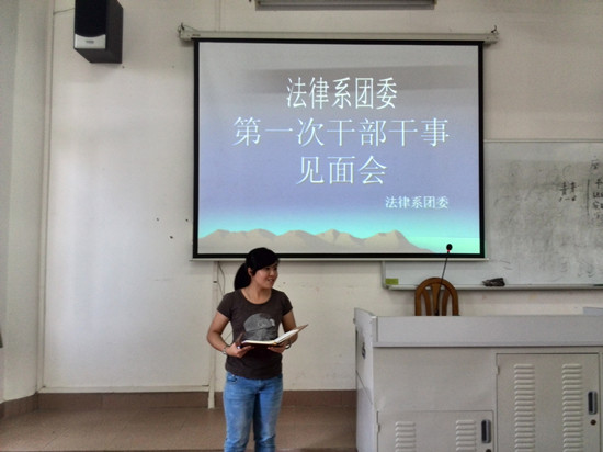2013年10月10日中午12时,法律系团委于D2-103举办了法律系团委干事第一次见面会。到场的嘉宾有法律系团委书记叶小办老师、副书记祝建波老师和团委各部门的干部干事。