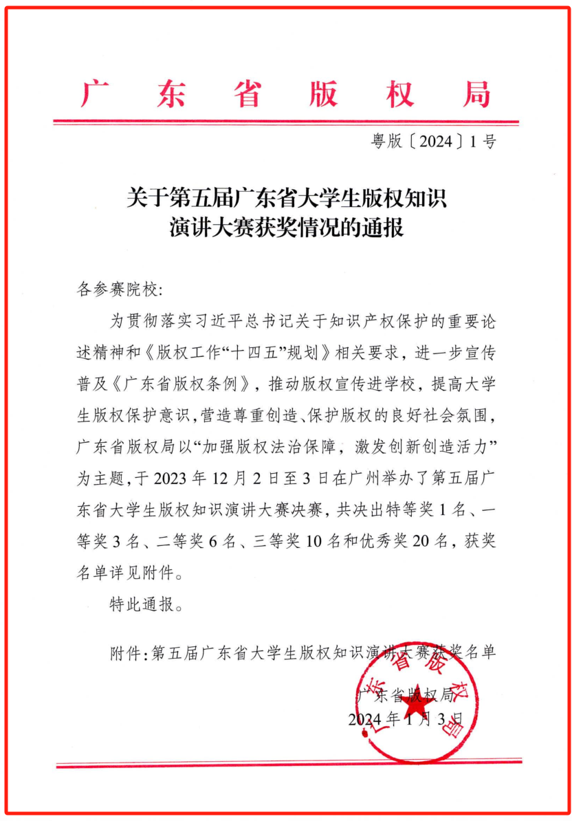 2023年12月2日至3日,由广东省版权局主办、广东省版权保护联合会承办的第五届广东省大学生版权知识演讲大赛决赛在广州举行。本届大赛主题为“加强版权法治保障,激发创新创造活力”,报名参赛的高校多达39所,囊括了中大、华工、暨大等著名学府,参赛选手涵盖了法学相关专业的在校研究生、本科生、专科生。经初赛选拔,最终有30所高校的80名选手进入决赛。经过9位评委现场打分、2位督导现场统计,决出特等奖1名、一等奖3名、二等奖6名、三等奖10名、优秀奖20名,并于1月8日公布。