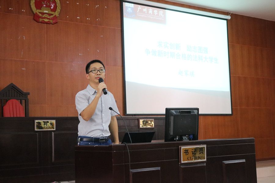 会议伊始,由2016级新生辅导员葛任老师作新生寄语,希望新生在大学四年里能够各施所长,不留遗憾。随后,赵家琪为新生做了“求实创新 励志图强 争做新时期合格的法科大学生”专题讲座。首先,他向新生详细讲述了法学专业的奋斗目标和作为法学专业的人才培养目标、路径,提出合格法科大学的标准以及做一个合格的法科大学生的标准,其中包括尽快掌握大学的学习方法、注重培养法律人的思维、善于做计划有效利用时间、建立一个奋斗的目标以及对自己未来的人生作出合理的规划;其次,他还向新生介绍了法学实习基地、法学实验室;最后他期望,每一名新生都能够尽快适应大学生活,掌握法学专业知识的同时,培养自身的兴趣爱好,积极锻炼身体,提升自身的各项能力,合理规划时间,最大化利用时间,做一名德、智、体、美全面发展的大学生。