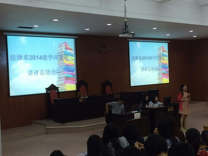 4月19日星期一下午,法律系2014级在A209模拟法庭召开“法律系2014级学风建设讲评总结大会”。本次会议由辅导员张仁瀞老师主持,2014级全体同学参加了本次会议。