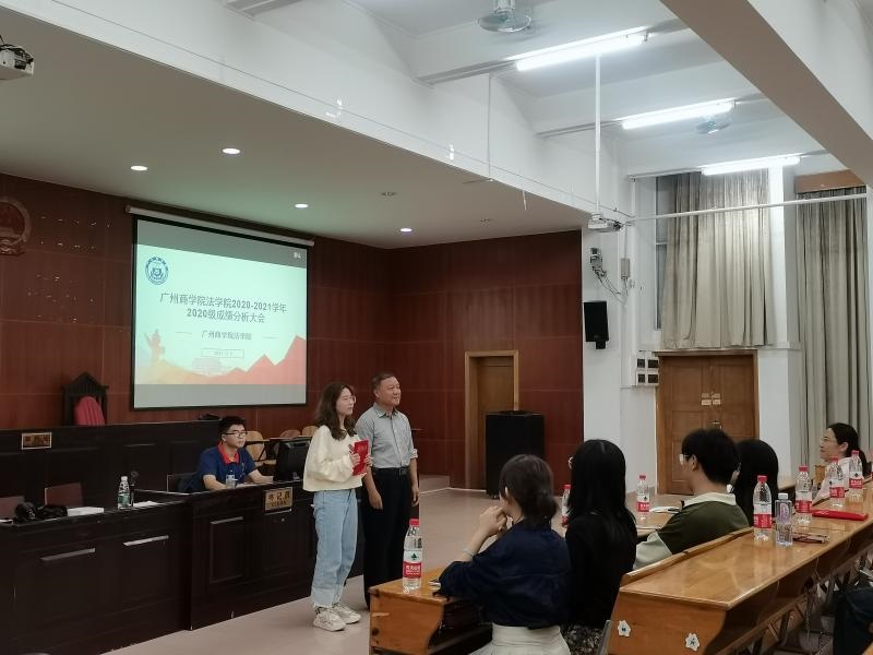首先依次由各班学习委员通过PPT向同学们汇报大一下学期的成绩,通过两个学期的成绩进行对比,在表扬进步之余指出以下问题:各班级的成绩两极分化严重、总分拔尖的同学较少、公共必修课挂科率相对较高,并建议同学们能够针对自己的弱势学科做出相应的对策,用思维导图的方法来构建知识框架以达到事半功倍的效果,通过上课积极回答问题来提高平时分、重视公共必修课。其次是颁奖环节,由赵家琪、陈秀图分别为获奖的陈莉、叶丽君、李凯津、吴学君、李泳、张蓉纯颁奖。姚多娇博士针对20级各班同学的具体情况,给出了多种建议并表示:“同学们的学习不是一时的,而是终身学习,未来的学习之路还很长。”赵家琪提出:“法律者,善及公正之术也”的观点,并表示:“学习不能给自己留后路,应该巩固基础,做到抽象的知识具体化,达到将学到的知识灵活运用的程度。”