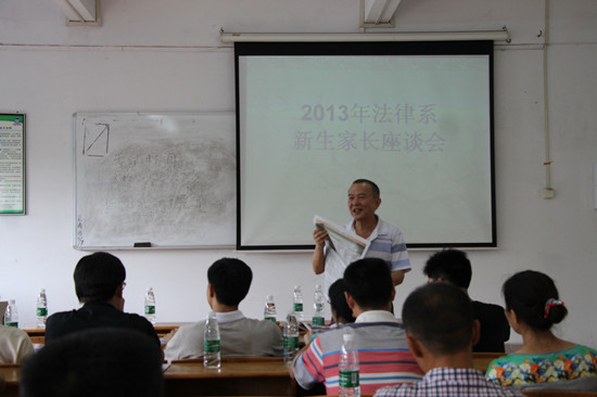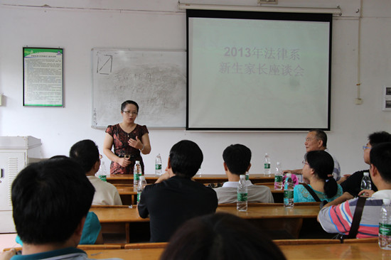 2013年9月7日下午13:00,法律系在教学楼B106举行2013级新生家长座谈会,出席本次家长座谈会的主要有:法律系陈文椿主任、法律系党总支陈秀图书记、法律系部分教师以及2013级新生的家长们,本次座谈会由法律系主任助理欧洁梅老师主持。