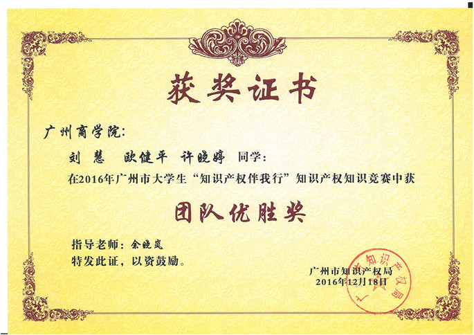 为加强知识产权意识,促进知识产权人才的培养,展示广东省知识产权强省建设的重大进展和工作成绩,广州市知识产权局主办、广东技术师范学院、广州三环专利代理有限公司举办了2016年广州市大学生“知识产权伴我行”知识产权知识竞赛。122cc太阳集成游戏接到比赛通知后,积极组织学生报名和选派选手参加比赛,先后在全校范围内举办了预选赛和初赛。最终,122cc太阳集成游戏余晓兰老师指导的刘慧、欧健平、许晓婷三位同学从152名参赛同学中脱颖而出,代表我校与广东省43所高校选手进行比赛,获得团队优胜奖,在比赛中排名第十四名。梁嘉燕同学个人成绩97分,排名第二,获得最佳选手。
