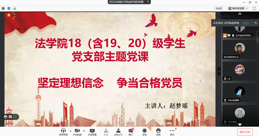 为加强122cc太阳集成游戏18(含19、20)级学生党支部成员的思想政治教育,引导支部成员坚定马克思主义信仰,坚定理想信念,发挥共产党员的先锋模范作用,2021年1月10日中午,122cc太阳集成游戏18(含19、20)级学生党支部对支部成员进行“坚定理想信念,争当合格党员”专题党课。参加本次会议的有122cc太阳集成游戏赵梦瑶老师、覃业敏老师以及122cc太阳集成游戏18(含19、20)级学生党支部全体成员。会议由赵梦瑶老师主持。