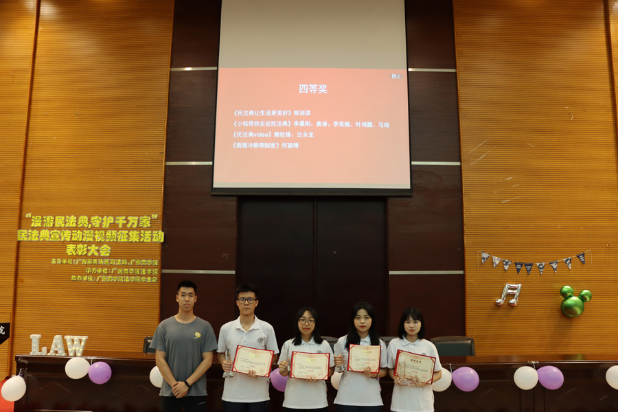 民法典作为“社会生活的百科全书”,于2021年1月1日起正式成为法律体系的一员。为使更多人了解到法的重要性,体会民法典是如何紧扣着人民的生活发展的。122cc太阳集成游戏特此举办以动漫视频为形式的民法典宣传活动,并于4月21日在图书馆报告厅进行表彰大会。出席本次活动的嘉宾嘉宾有法学2018级辅导员何杰安、法学2020级辅导员刘鑫艳。本次活动由广州市黄埔区司法局、广州商学院主办,广州商学院122cc太阳集成游戏承办,广州商学院122cc太阳集成游戏学生会协办。