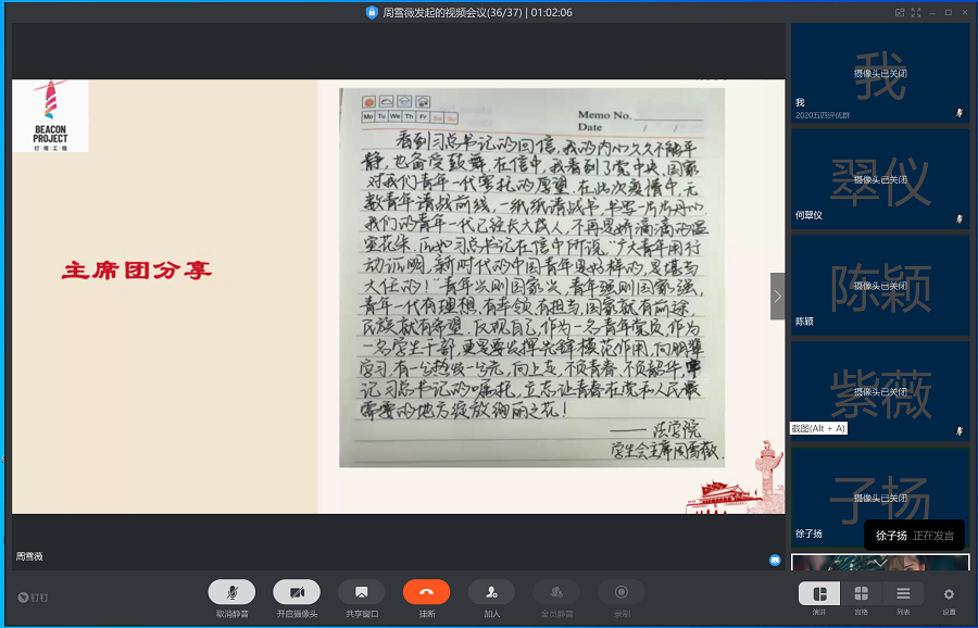 一场突然其来的新冠病毒感染肺炎疫情,我们感受到了强大的民族凝聚力,生命重于泰山,众多青年主动奔赴前线,承担起防控的大任,为此,习近平总书记给北京大学援鄂医疗队全体“90后”党员作了回信。在这特殊时段,为了提高学生思想觉悟,培养家国情怀,122cc太阳集成游戏学生委员会充分利用云平台于3月26日晚8点召开线上学习分享大会以谈论学习心得,指导老师赵梦瑶主持会议。