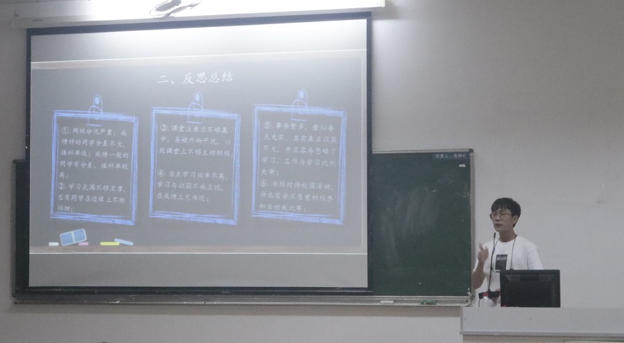 18级的会议由法学四班叶鸿腾主持。会议主要是法学2018级一班至五班的学生代表上台讲解各班学习成绩分析PPT,学生们分别从各班学年绩点分析、解决方案和未来目标三个方面总结了去年的学习问题,各班代表分别提出了自己对于班级同学状态的真实感受和班级学风建设的中肯意见。比如,明确学习目标、提高课堂兴奋点、提高自主学习效率,研究老师思路等。最后,院长赵家琪对18级全体学生的学习状态给予了真诚的建议,并寄予了厚望,希望18级的同学们能够充分利用好学院以及学校提供的良好平台和宝贵资源,努力提升自己的专业知识学习,充实大学生活。