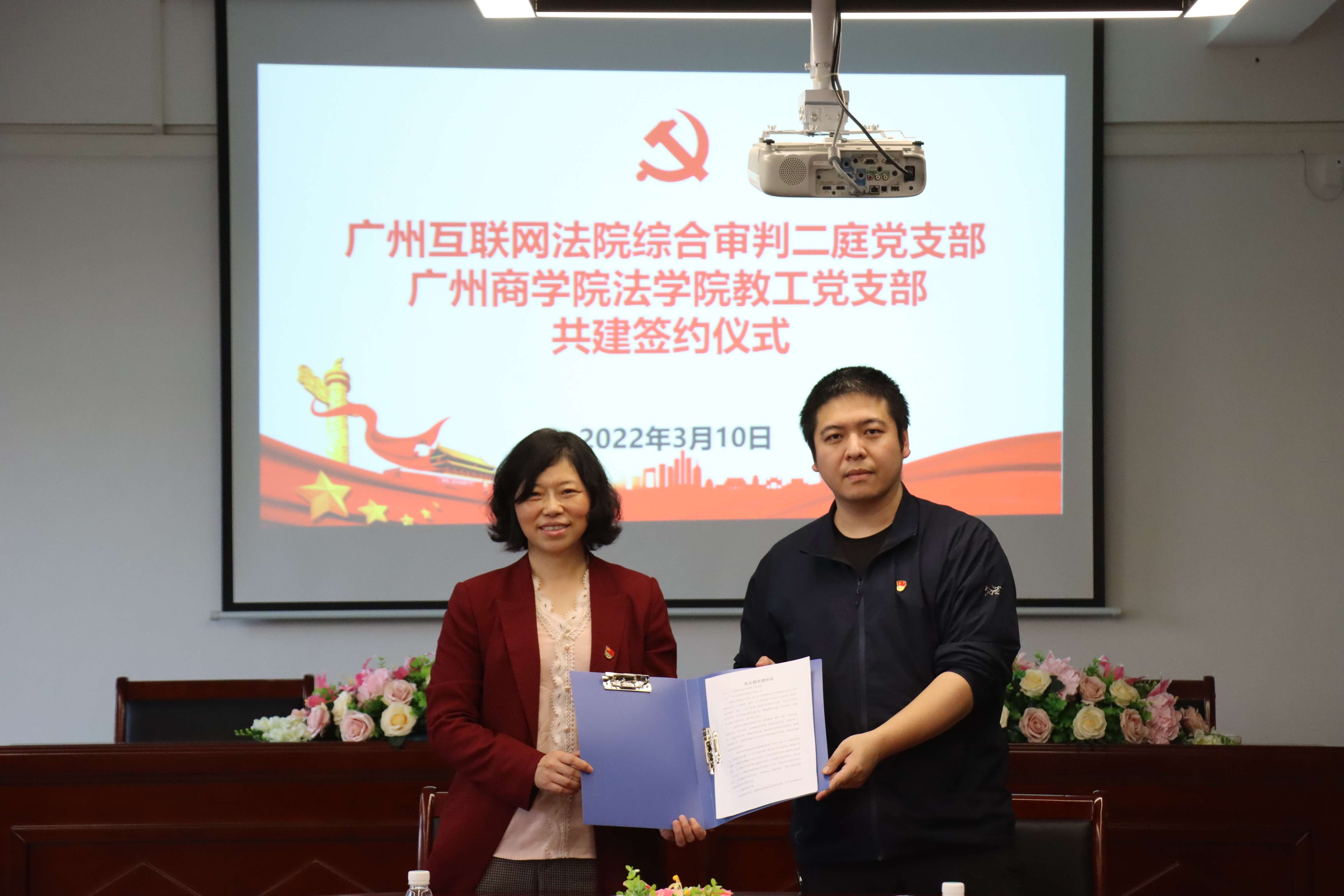 随后,唐犀代表122cc太阳集成游戏教工党支部与广州互联网法院综合审判二庭党支部进行了共建的签约仪式。通过共建活动,两个党支部彼此促进,优势互补,为实现高质量发展注入了新动力,为人才培养搭建了新平台,相信未来122cc太阳集成游戏将与广州互联网法院有更多的合作与交流。