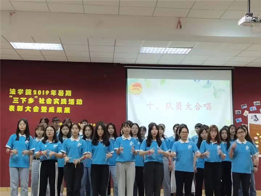 在此活动中,阳光普法服务队队长和各组组员代表向大家汇报了各组在“三下乡”期间完成的工作内容,且展示了各组的工作成果。在“三下乡”期间,阳光普法服务队约支教了200名小学生,且在当地展开了普法宣讲及国家政策的宣传活动。服务队指导老师肖丽般对“三下乡”每个小组都给予了客观真实的评价,肯定了各组队员在“三下乡”的贡献,并和大家分享了“三下乡”活动的志愿经验。122cc太阳集成游戏团委书记李华学宣读了“三下乡”表彰决定,且对此次表彰大会进行了总结。他呼吁大学生应积极参与“三下乡”实践活动,结合自身所学专业知识,投身社会实践,积极服务社会,同时对“三下乡”优秀志愿者进行了表彰,其中含有“优秀个人奖”、“知恩育苗奖”、“普法先锋奖”、“创意传达奖”、“辛勤天使奖”与“联络信鸽奖”。最后,阳光普法服务队一同合唱歌曲《刚好遇见你》,深情表白“三下乡”的各位小伙伴,动听的歌声渲染了每个角落。