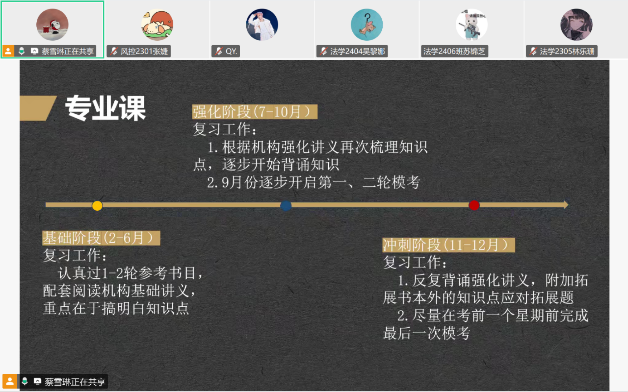 分享会主要围绕考研与法考的选择、备考策略及个人经验分享三个方面展开。蔡雪琳就自身备考西南政法大学宪法学与行政法学专业的经历,从不同角度向同学们分享了备考方法,并从学习方法和择校逻辑两方面提出了相关建议。同时,蔡雪琳强调考研与法考需谨慎选择,同学们要根据自身学习能力、复习科目重合度、抗压能力和复习比重来制定适合自己的备考方案。