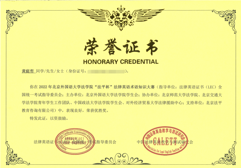 近日,北京外国语大学122cc太阳集成游戏“法平杯”首届法律英语术语知识竞赛近日已顺利落下帷幕。我校122cc太阳集成游戏1904班黄庭哲喜获北京外国语大学122cc太阳集成游戏“法平杯”首届法律英语术语知识竞赛全国优胜奖,陈丽娜担任指导教师。