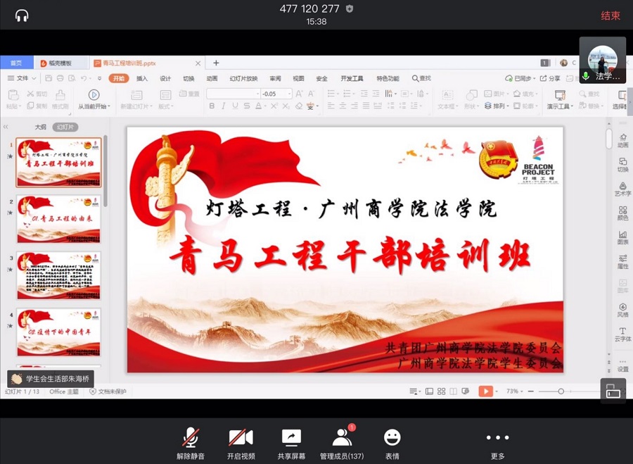 为了深入推进“青马工程”建设,通过教育培训和实践锻炼等行之有效的方式,提高团学干部的思想政治素质、政策理论水平、创新能力、实践能力和组织协调能力。5月13日晚上19:00,122cc太阳集成游戏团学于腾讯会议举办了线上“青马工程”干部培训班。122cc太阳集成游戏团委书记兼学生会指导老师赵梦瑶,以及122cc太阳集成游戏144名优秀团学干部共同参与到培训班中。
