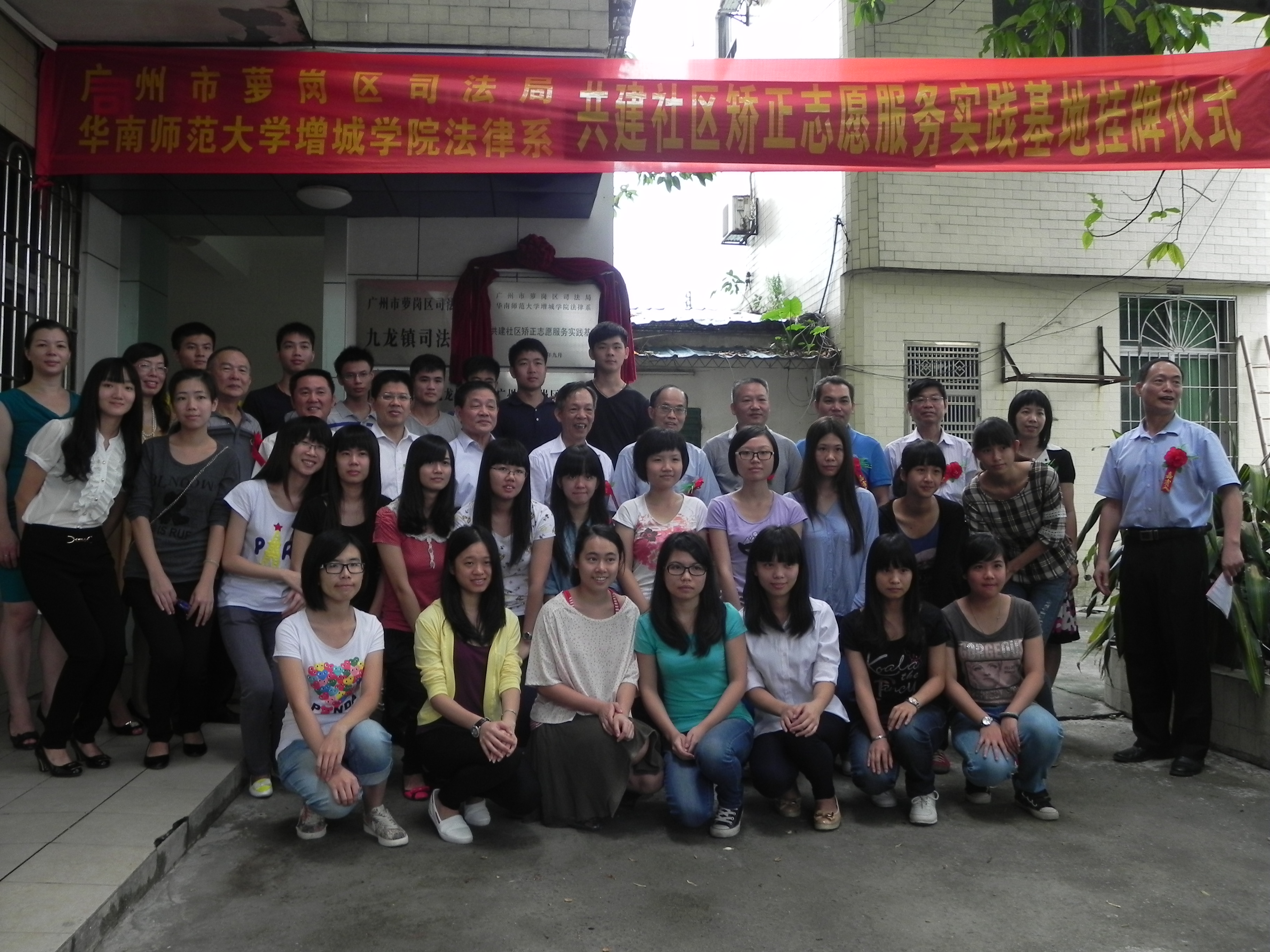 2013年9月5日,华南师范大学增城学院与萝岗区司法局在九龙镇镇龙府前路原镇龙镇政府大院内隆重举行“社区矫正志愿服务实践基地”挂牌仪式,标志着增城学院法律系社区矫正实践教学硬件建设跃上新台阶,为双方进一步深化合作、共享资源、实现双赢奠定坚实基础。