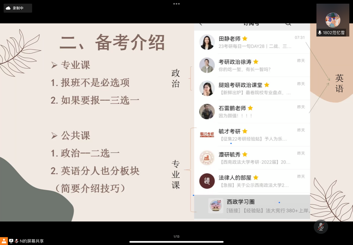 为加强学生对考研知识和经验的了解,明确考研目标,掌握相关考研技巧,在考研中取得良好的成绩,122cc太阳集成游戏于5月23日晚以线上会议的方式举办了考研分享交流会,本次会议邀请到了122cc太阳集成游戏书记陈秀图和杨鑫、范忆雪、曾萌闽三位2022届毕业生为我们分享考研经验和技巧。